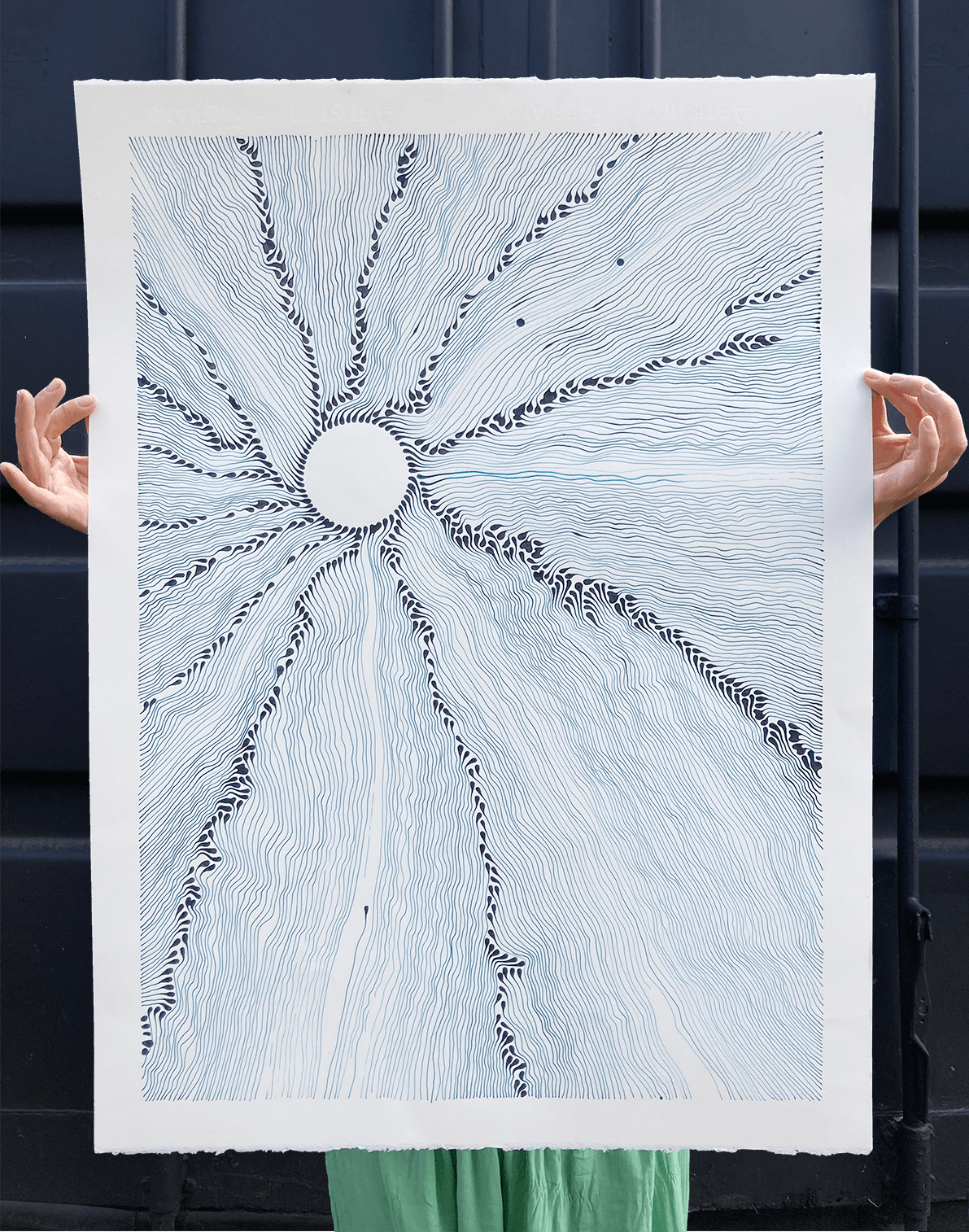 In this series I repeatedly drop ink from a central point or the edges of the paper and draw outwards. Each line attempts to follow the line before. Natural irregularities occur that have the effect of creating a wave like texture giving the illusion of a three-dimensional surface. In addition to the ink based works I experiment with another technique: scratching lines into oil paint to reveal the lighter acrylic colour underneath. The repetition of this again produces a three-dimensional quality. The thickness of the oil paint and lines give a contoured impression reminiscent to me of skin and land.